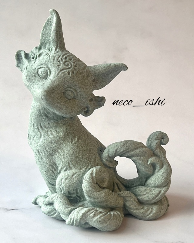 九尾狐さん 青石 産地:中国 身長:119.3mm 横幅:88.0mm 奥行:65.4mm 体重:253g 美しすぎる九尾狐ちゃんが入荷しました♪ 見た瞬間、ときめいてしまいまったこの子! ほんとに美しいです、、、 青石なので、お外に飾るのもOK☆ 水に濡れると、色が濃い緑色に変身します! 乾くとまた薄い緑に戻ります。 オイルを塗ってしまうと薄い緑に戻らなくなってしまうのでご注意下さいませ。 ぜひぜひ、お迎えお待ちしております♪ 九尾狐の効果☆ 九尾狐の置物は、風水的な効果として、長寿と繁栄、邪気払い、金運や幸運の招来、家内安全をもたらすとされています。また、置物の素材やデザインによっては、癒し、健康、仕事の成功、円満な人間関係などの特定の効果が期待できます。 主な効果 長寿と繁栄: 九尾の「九」という数字は、風水で陽数の最大値であり、長寿と繁栄を象徴します。 邪気払い・厄除け: 邪悪な霊を祓い、悪霊を遠ざける効果があると言われています。特に職場の悪者を避けるのに役立つとされます。 金運・幸運の招来: 積極的な富や、仕事での成功(出世)、幸運を引き寄せるとされています。 家内安全・平和: 家内安全、健康、平和をもたらす効果があるとされています。 愛の成就: 愛を守り、愛の傷を癒すといった効果もあるとされています。