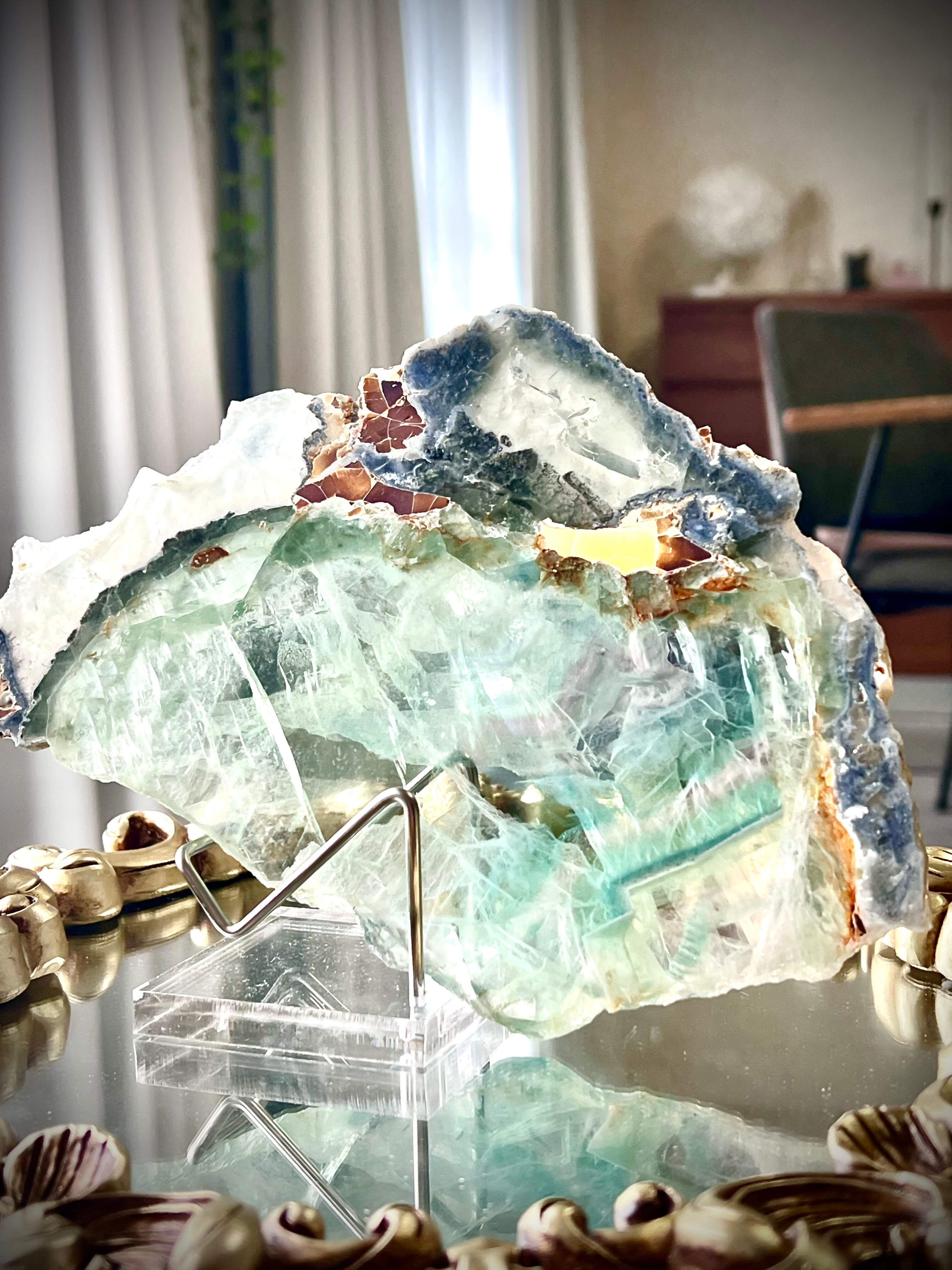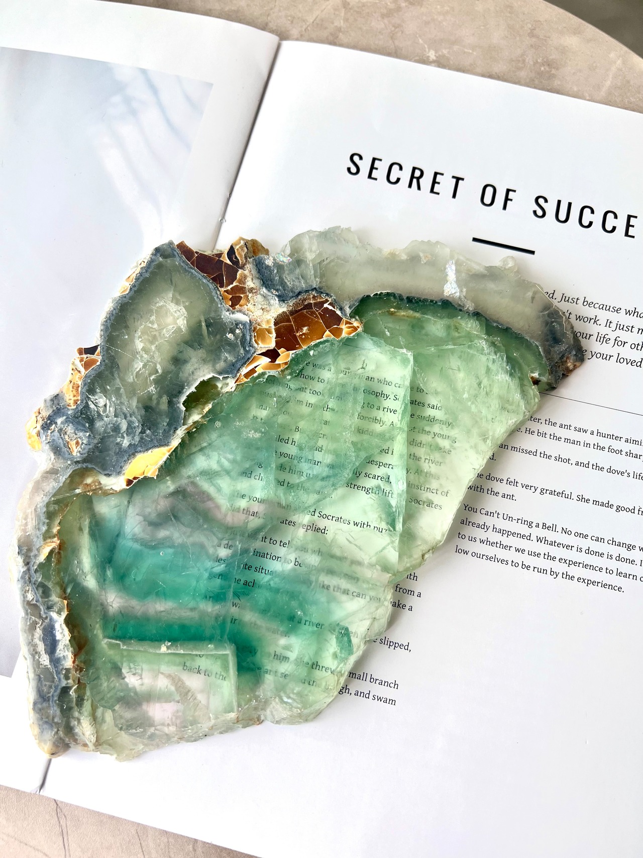フローライトのスラブは、集中力や記憶力を高め、思考を柔軟にする効果があるとされています。また、ネガティブな感情を解消し、ストレスを緩和する効果も期待できます。特に勉強や受験など、高い集中力を必要とする場面で、フローライトスラブは役立つとされています。さらに、自由を求める心を強め、創造力を高める効果も期待できます。